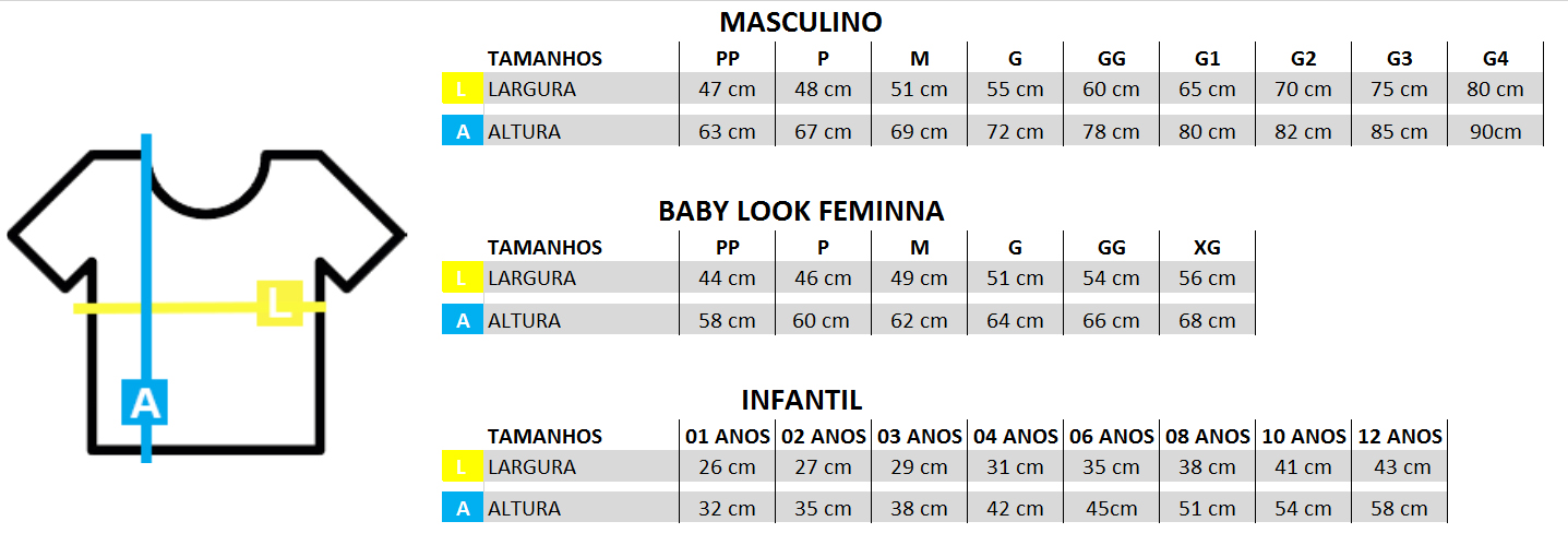 Antes de comprar observe qual tamanho de camiseta é ideal para quem irá vestir, para isto, indicamos nesta página o tamanho aproximado de cada camiseta. Os valores das medidas abaixo estão expressos em centímetros, podendo ter uma variação de até 2 centímetros em cada medida.